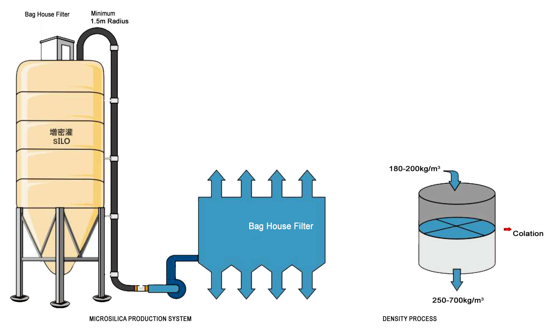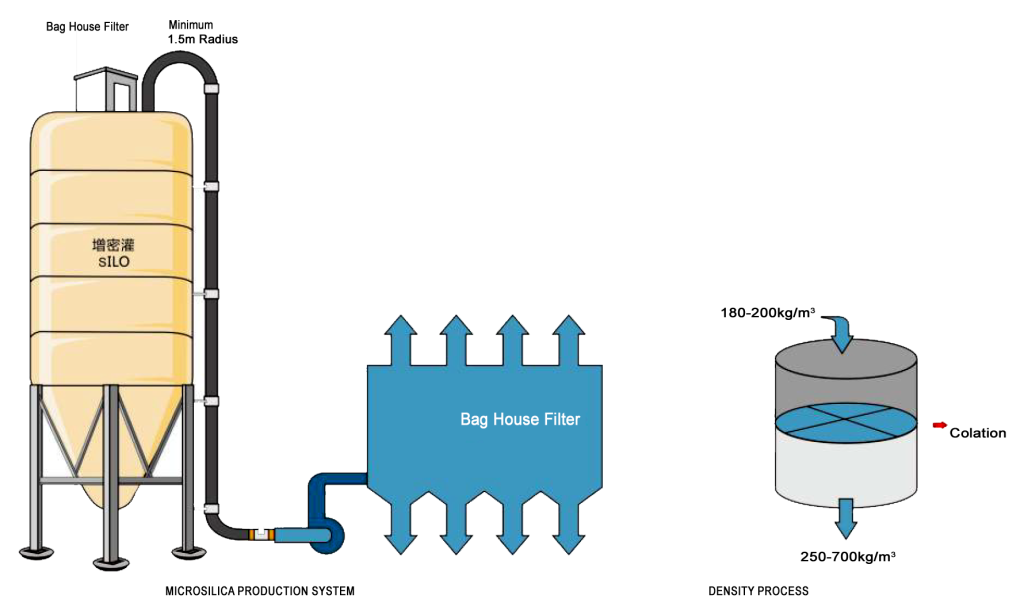 The quality of the raw materials and the operation of the furnaces determine the purity of the Microsilica. Although the material is collected as a very fine powder with a bulk density in the region of 200kg/m3, it can be processed to densify it, making the B/D around 250-700kg/m3.